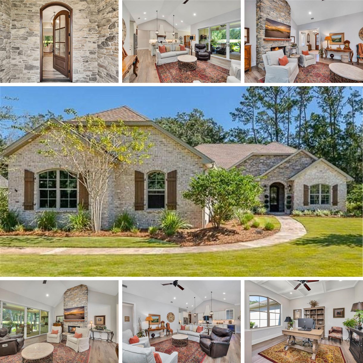 Natural light fills the home through arched architectural windows with UV-filtering glass, while floor-to-ceiling retractable glass doors seamlessly connect indoor and outdoor living. Eight-foot solid core interior doors, a custom front entry, soaring 10–14-foot ceilings, and luxury vinyl plank flooring set the stage for timeless elegance. The family room is anchored by a dramatic 14-foot stacked stone fireplace with gas logs, a reclaimed heart of pine mantel, and a coffered ceiling that adds architectural depth.